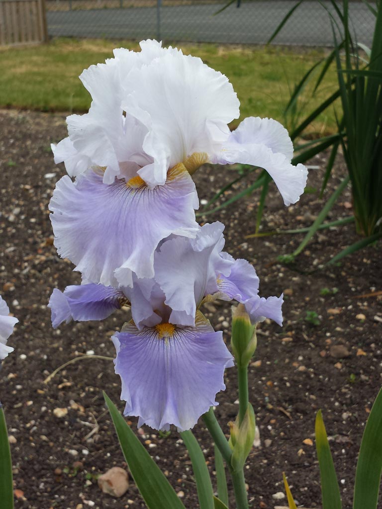 A striking iris with heavily ruffled blue white standards, with slightly ruffled purple falls and lavender markings across the shoulder and under the beard. Beards are lavender with orange in the throat.